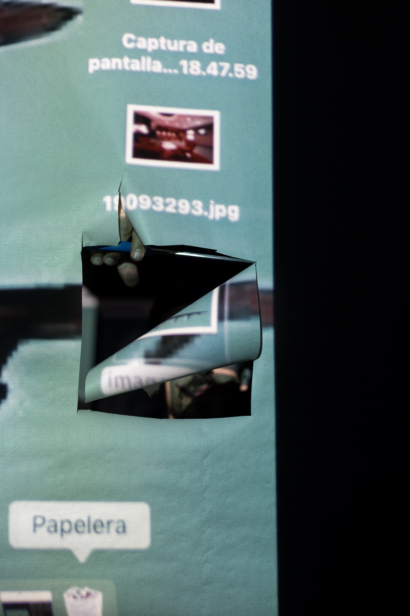 El proceso partió de preguntas sobre la materialidad de la proyección y buscó emprender un viaje desde la pantalla hasta los cuerpos del público. Las búsquedas se realizaban siempre al azar, en función de la búsqueda anterior, de modo que el dispositivo funcionaba como una sesión de VJing improvisada.